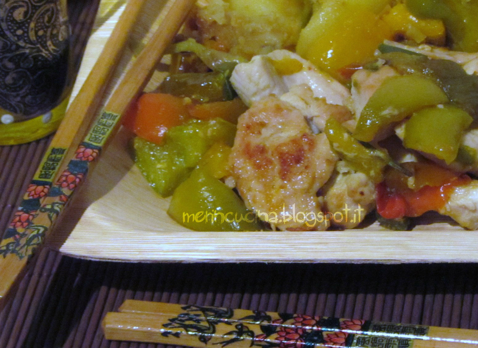 In realtà nel piatto di bambù c’è un più tradizionale pollo, peperoni e patate che però ha un sapore familiare, mediterraneo e super gustoso!